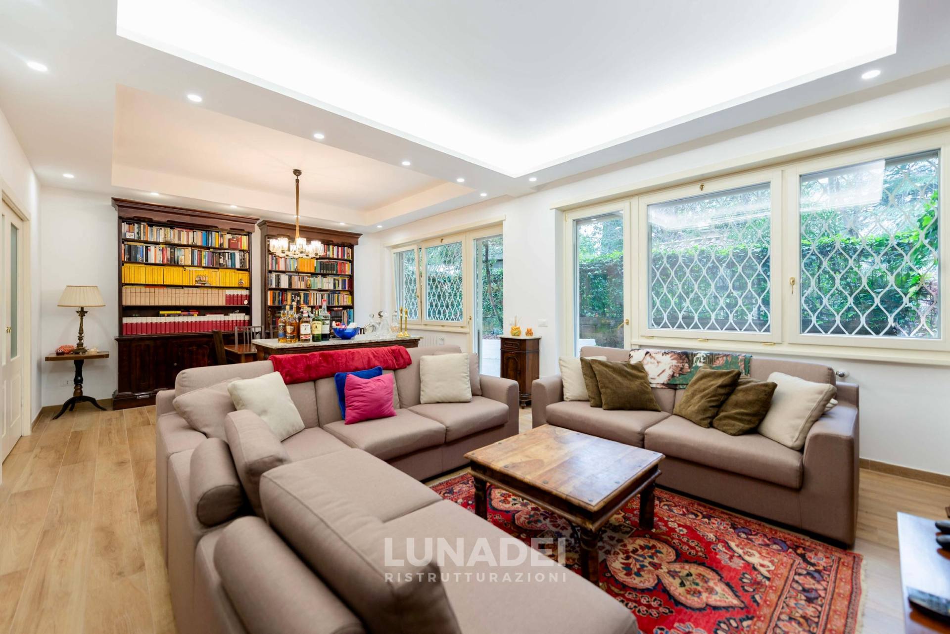 Grande protagonista è la libreria in legno massello su misura, che impreziosisce il soggiorno, diventando un elemento di arredo funzionale e di carattere. L’arredo misto tra classico e moderno conferisce un’eleganza senza tempo, perfetta per un’abitazione accogliente e sofisticata.