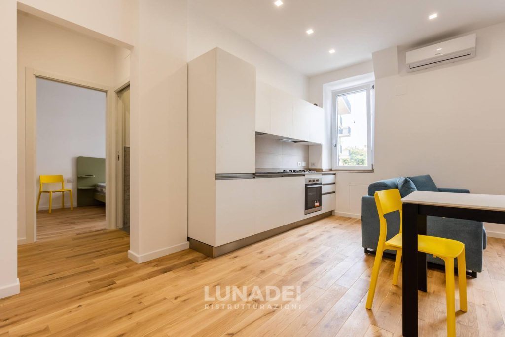 Per migliorare la vivibilità dell’appartamento, la disposizione interna è stata rivisitata completamente. La modifica delle tramezzature ha permesso di ottenere spazi più ariosi e funzionali, rendendo il soggiorno più ampio e luminoso.