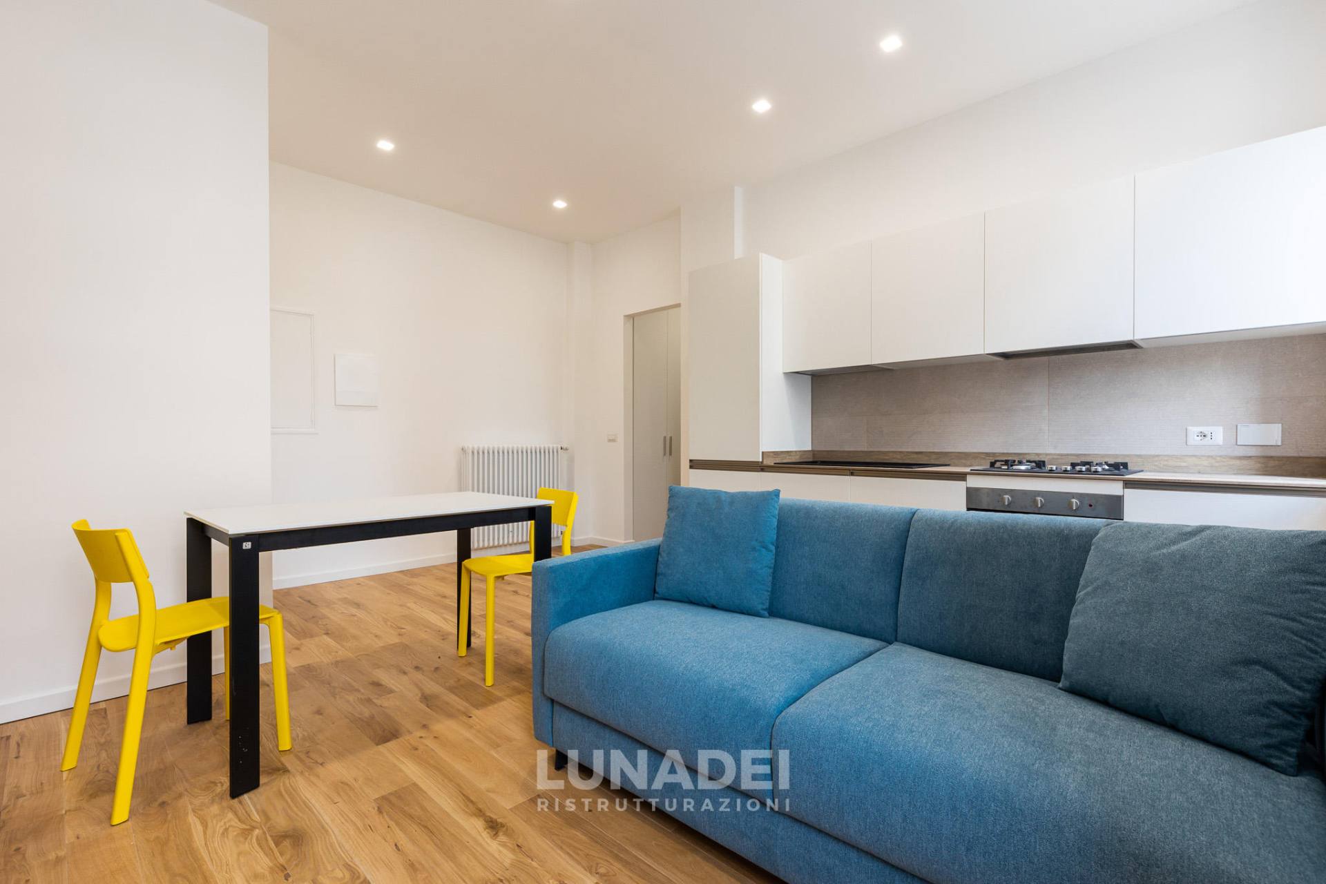 Per migliorare la vivibilità dell’appartamento, la disposizione interna è stata rivisitata completamente. La modifica delle tramezzature ha permesso di ottenere spazi più ariosi e funzionali, rendendo il soggiorno più ampio e luminoso.