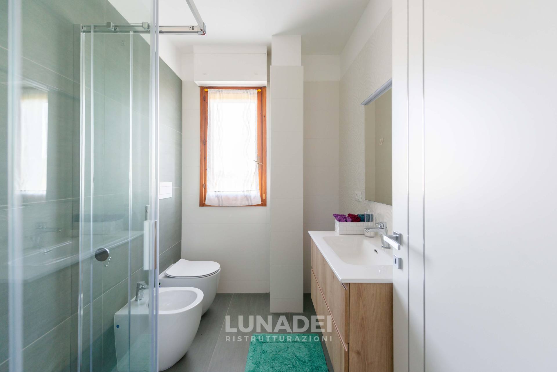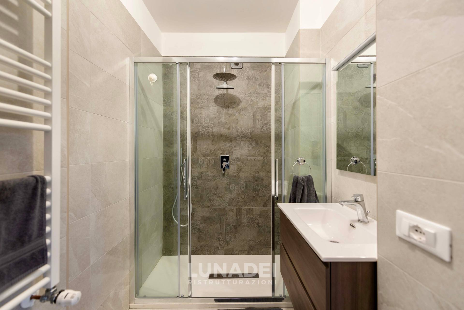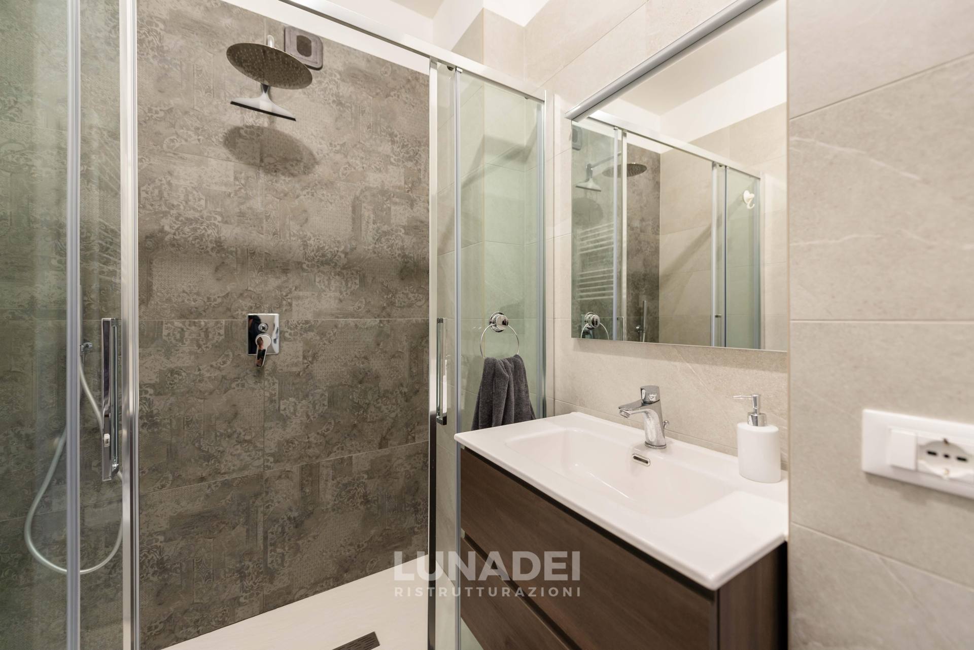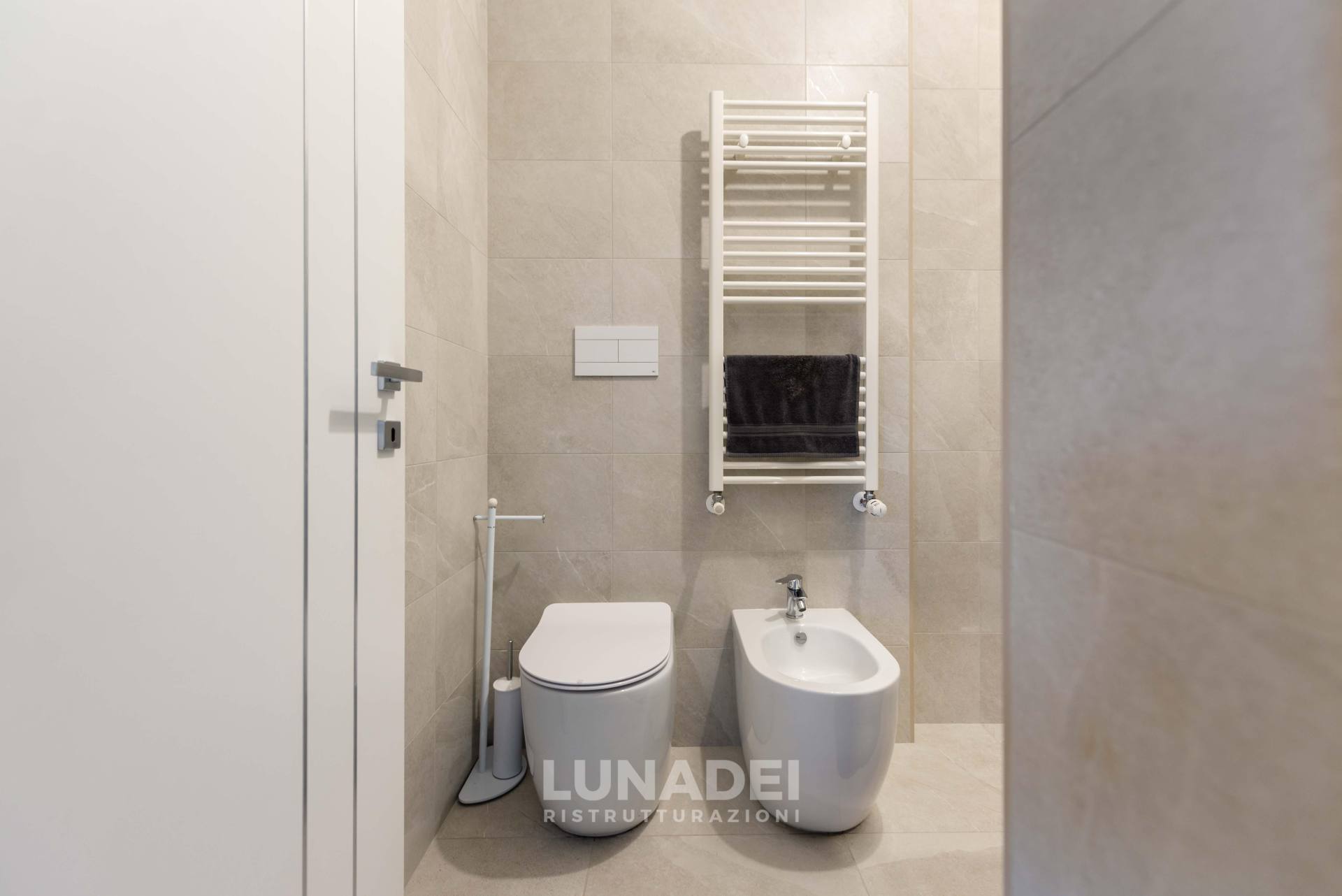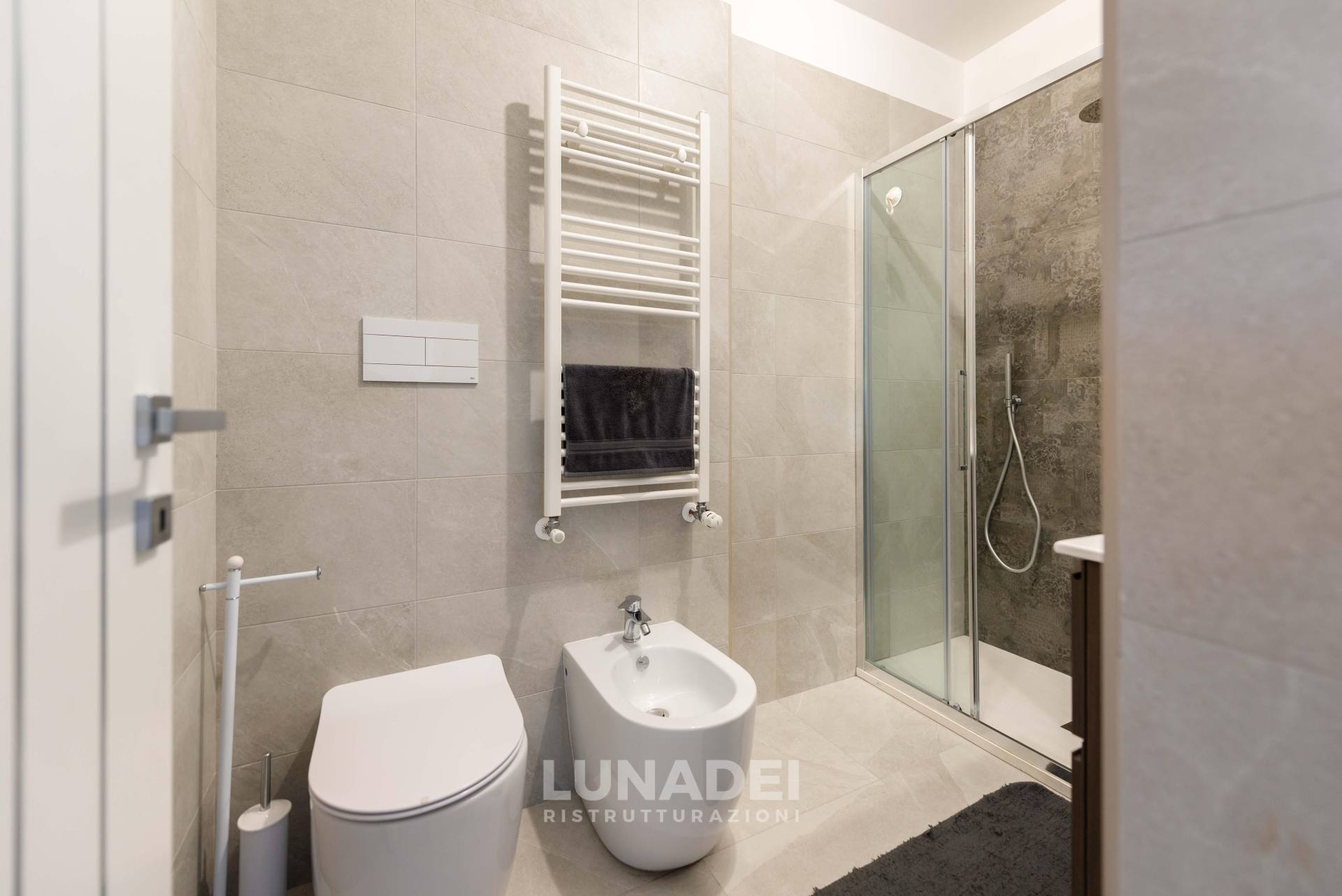 I due bagni sono stati completamente rinnovati, scegliendo rivestimenti stone effect per un look moderno e materico. Per garantire un maggiore comfort termico, è stato inserito un sistema di isolamento nell’intercapedine, migliorando l’efficienza energetica dell’intero appartamento.