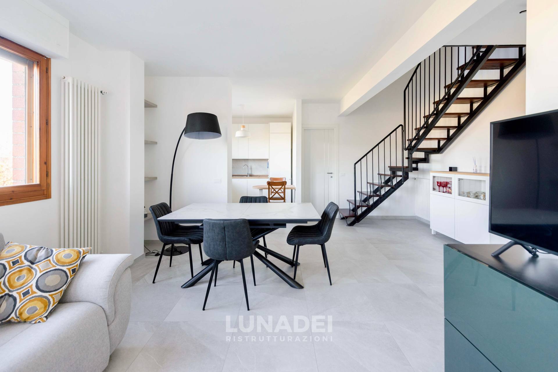 L’elemento chiave di Stratos è senza dubbio la scala interna, una struttura in ferro e legno che collega i due livelli con un’estetica solida e industriale. Il contrasto tra il metallo nero opaco e il calore del legno naturale crea un effetto visivo di grande impatto, esaltando la verticalità dell’appartamento.