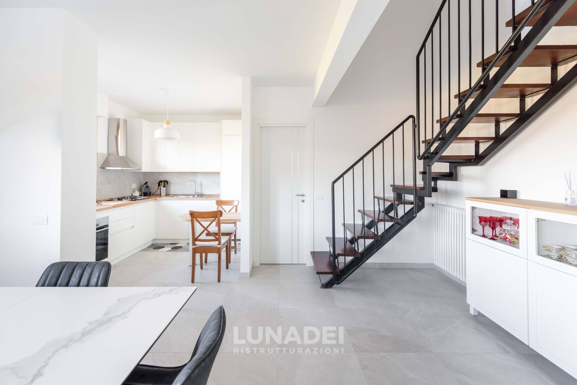 Le pareti, lasciate in tonalità neutre, permettono agli elementi architettonici di emergere, creando una base perfetta per un arredamento moderno e minimalista, in cui il contrasto tra colori freddi e materiali caldi si esprime con naturalezza.